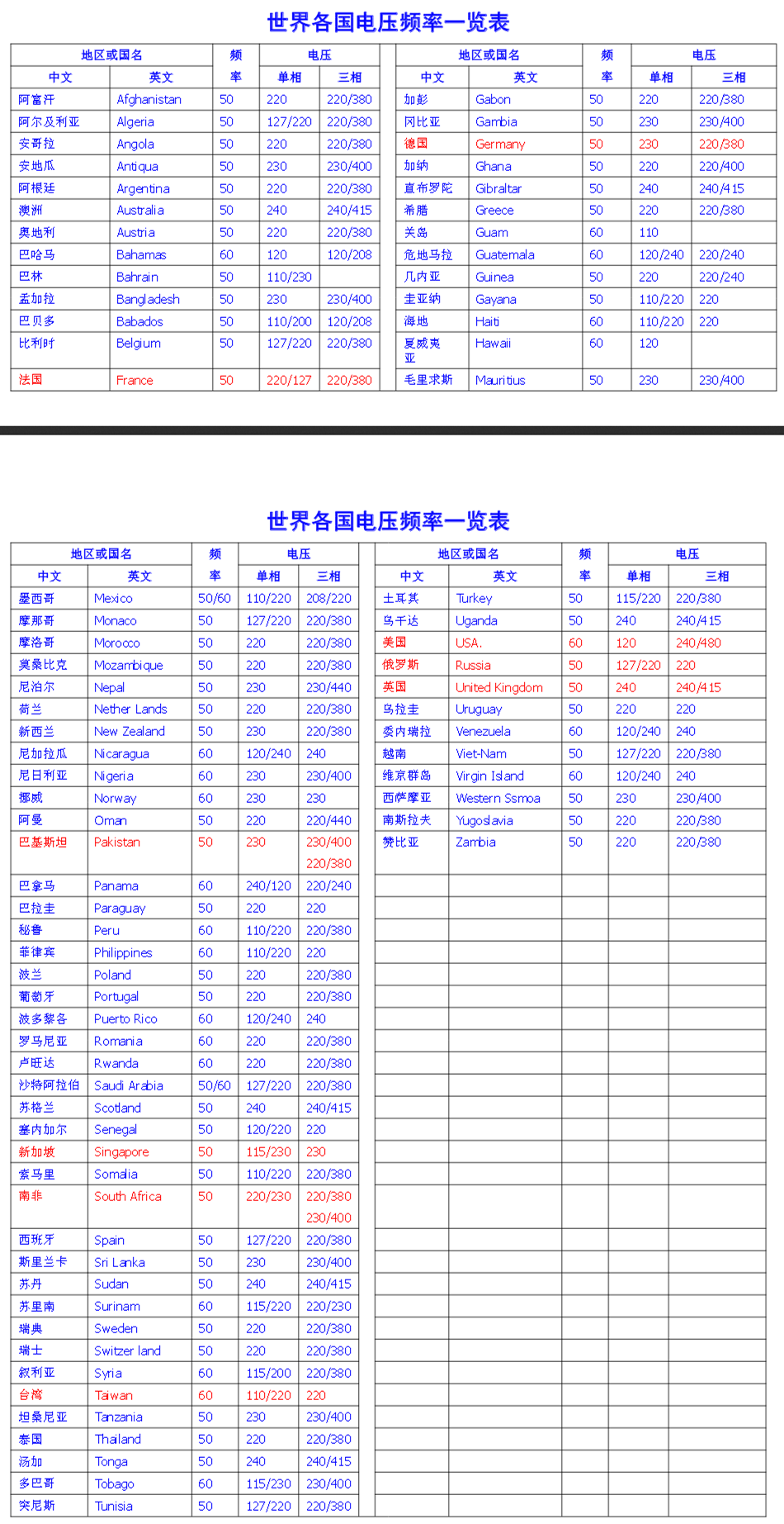 世界各國工業與民用冷水機組電源的電壓與頻率表
