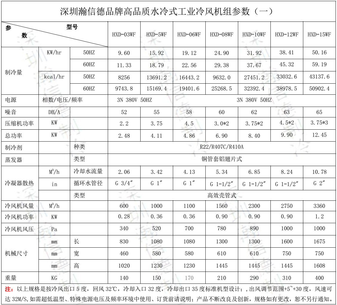機型選擇:深圳瀚信德品牌高品質水冷式工業冷風機有3HP-60HP水冷式工業冷風機可選, 特殊電源電壓/特殊頻率,3相440V/60HZ,3相220V/60HZ、3相480V/60HZ,零下10℃直出風、零下10℃直出風,使用R407C,R404A,R134A環保冷媒、出口型等特殊要求或更大機型可訂制,低于零下10以下出風需要做循環風制冷。